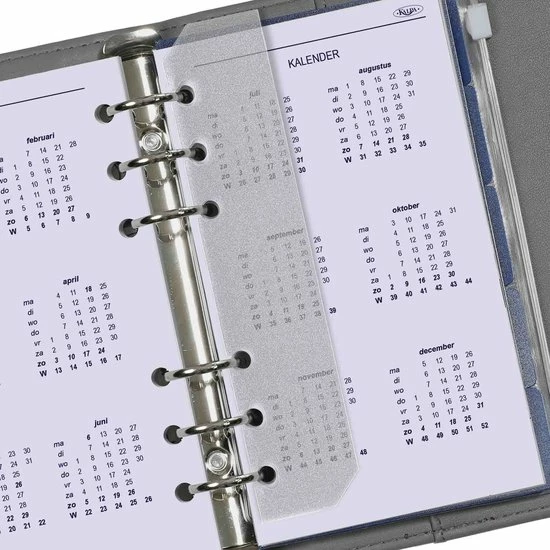 * De organizer is voorzien van tabbladen, doorzichtig vak met rits, pagina-scheider, notitieblaadjes en adresboekje.