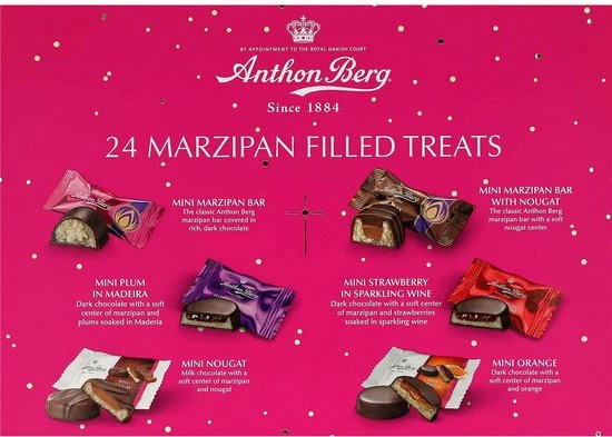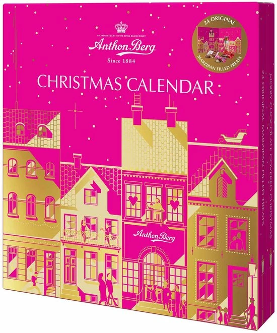 Een kerstkalender van Anthon Berg met gemengd gevulde marsepein met pure chocolade, één voor elke dag. Trakteer jezelf op een mooie kalender of geef hem aan iemand die je leuk vindt.
