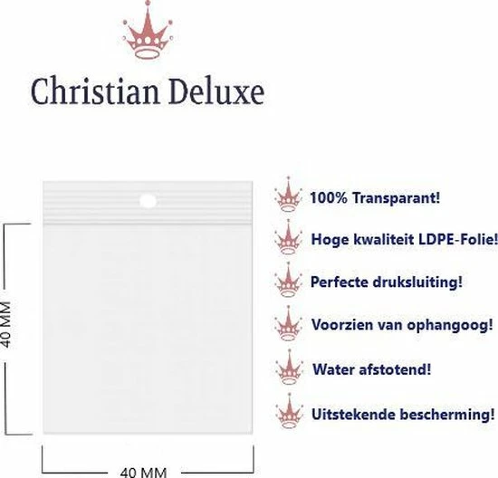 Christian Deluxe levert de gripzakjes in een verpakking van 100 stuks, hebben een afmeting van 4 cm breed en 4 cm hoog. De gripzakjes hebben een perfecte druksluiting en zijn voorzien van een ophangoog van 5 mm.