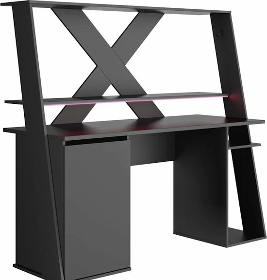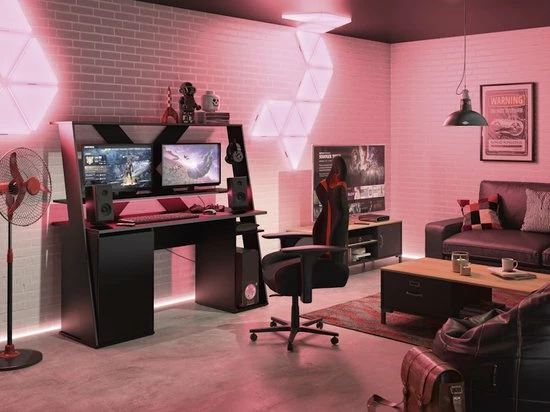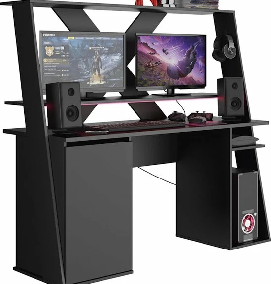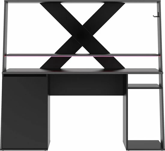 Supercool game bureau met ruimte voor 2 riante schermen. Een stevig en fraai afgewerkt bureau dat je kamer een fraaie boost zal geven. Vooral de stoere achterkant in X vorm valt erg op, maar ook de fraai afgewerkte zijkanten springen in het oog.