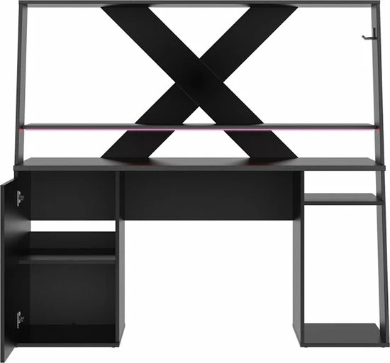 Aan de linkerkant onder het bureaublad een greeploos kastje om bijvoorbeeld games of andere spullen in op te bergen. Rechts onder het bureaublad een ruimte om een PC, Xbox of Playstation neer te zetten, met een handig schapje erboven. Aan de boven rechterkant een handige haak waar je je headset aan kan ophangen.