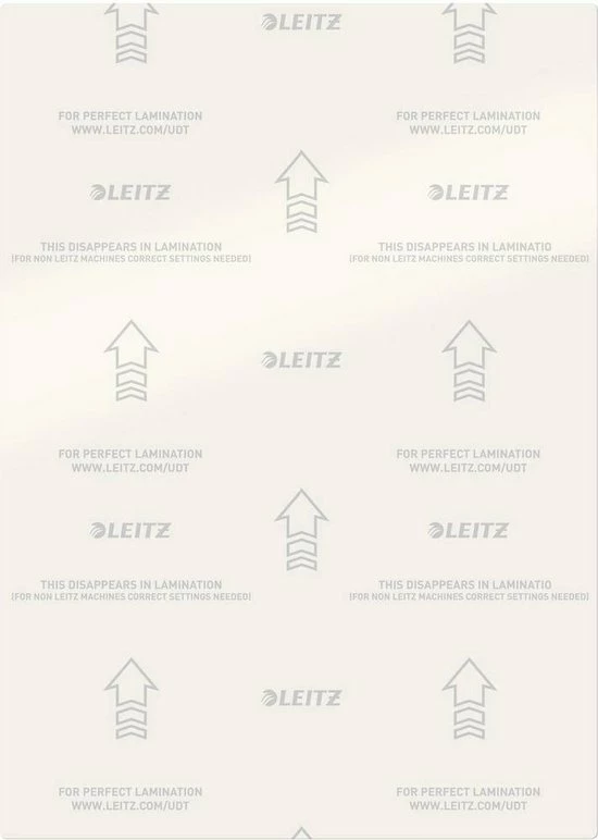 Ultra premium kwaliteit lamineersheets, lamineervellen, lamineerfolie bieden stevige bescherming tegen vuil, vloeistoffen en vocht. Deze lamineerhoezen bevatten pijlen die de invoerrichting aangeven (UDT). Dit helpt voorkomen dat de machine vastloopt doordat de gebruiker de lamineerhoes verkeerd invoert. De pijlen lossen vanzelf op bij een goed lamineerresultaat.