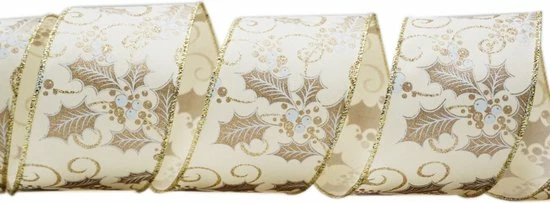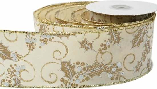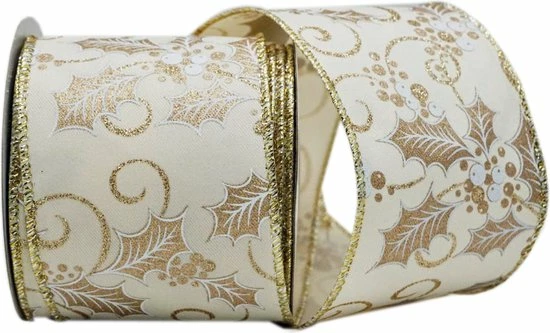Kerst Lint met IJzerdraad | Stoffen Lint | Twill Satijn Look | Luxe Weefband 38mm (3,8cm) | Hulstbessen Ivoor Wit Goud Glitter | Decoratielint | Kerstlint | Cadeaulint | Lengte: 3 Meter