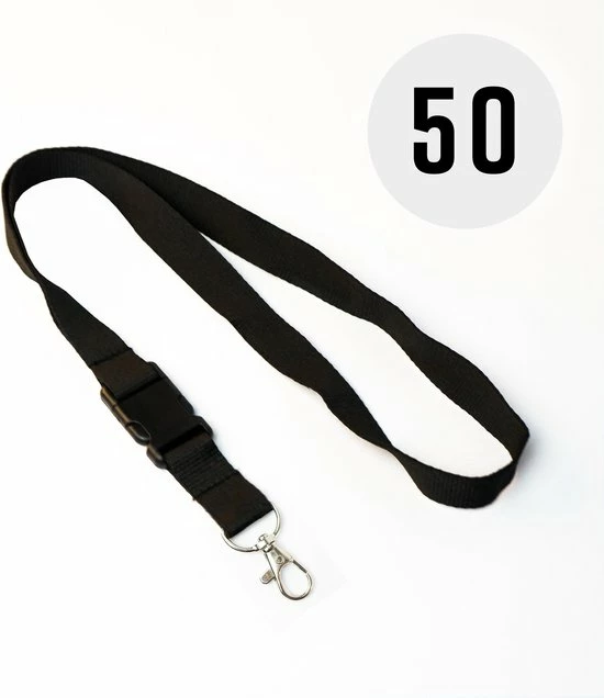 50x Zwart keycord / lanyard. Luxe uitvoering polyester band, 20 mm breed. Inclusief kunststof buckle sluiting en hanger.