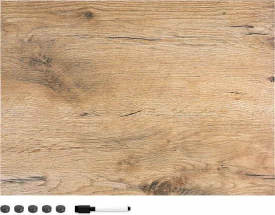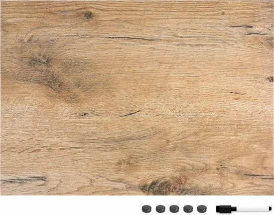 - DETAILS: Het magnetische bord is 90 x 60 x 2 cm groot en heeft een trendy houten look. Hij wordt geleverd met vijf magneetjes, een marker en bevestigingsmateriaal.