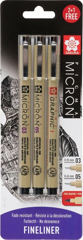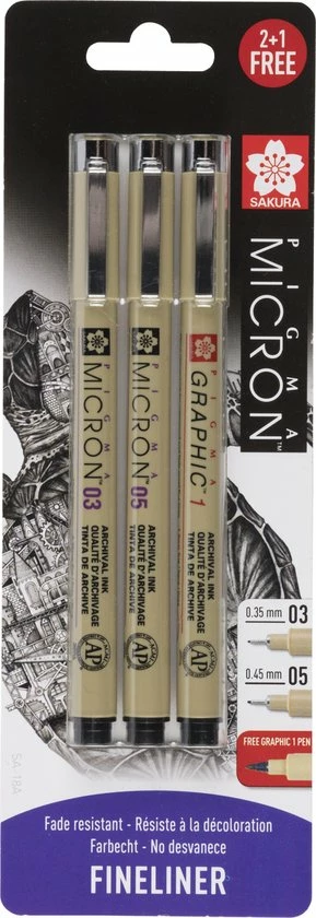Sakura Pigma micron set Zwart 01, 05 & gratis graphic pen.