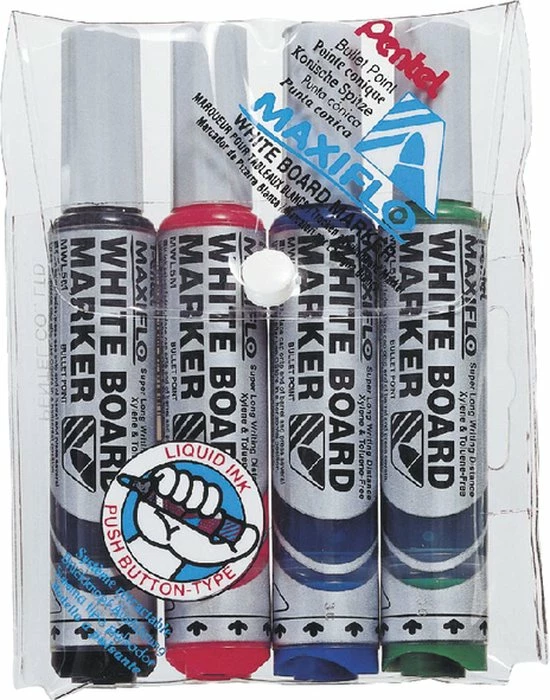 Whiteboardmarker met vloeibare inkt en spits toelopende schrijfpunt.