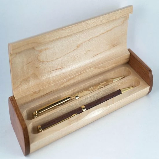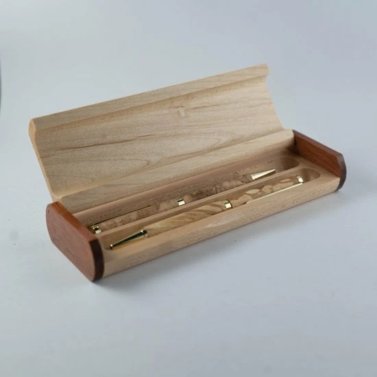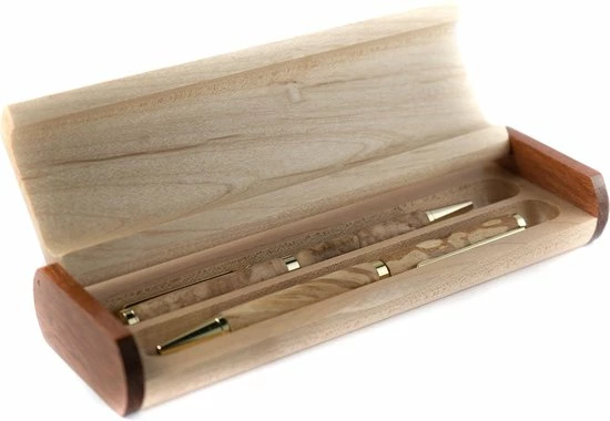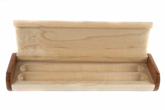 De pennendoos is handgemaakt van uniek Nederlands esdoorn hout in combinatie met met warme Braziliaanse mahonie hout.
