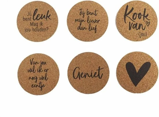 Mooie onderzetters van kurk bedrukt met verschillende teksten. De ronde onderzetters hebben een doorsnede van 7,5cm en zijn een halve centimeter dik.